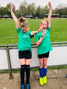 Wat geweldig is het dan als de ‘ jongensmoeders’ ’s morgens naar school komen met een zak vol voetbalschoenen en scheenbeschermers. ” Je kunt die meiden écht niet zonder scheenbeschermers laten voetballen hoor, ze worden bont en blauw.”