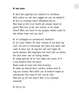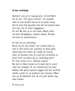 Gisteren was je er nog gewoon. Je knuffelde me en je zei: ” Tot morgen lieverd.” Je zwaaide toen ik naar buiten liep en ik zwaaide terug. Als ik toen had geweten dat het de laatste keer zou zijn was ik nooit weggegaan. En nu? Nu ben je er niet meer. Nooit meer. Je bent doodgegaan. Zomaar ineens, zonder me te waarschuwen.