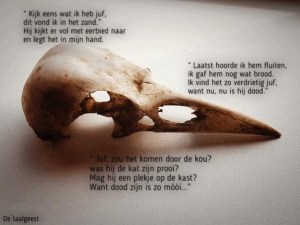 Dood gaan, overlijden, kleuters praten er nog heel open over. En waarom ook niet, het hoort bij het leven, hoe verdrietig ook. Deze kleuter kwam binnen met een prachtig schedeltje.