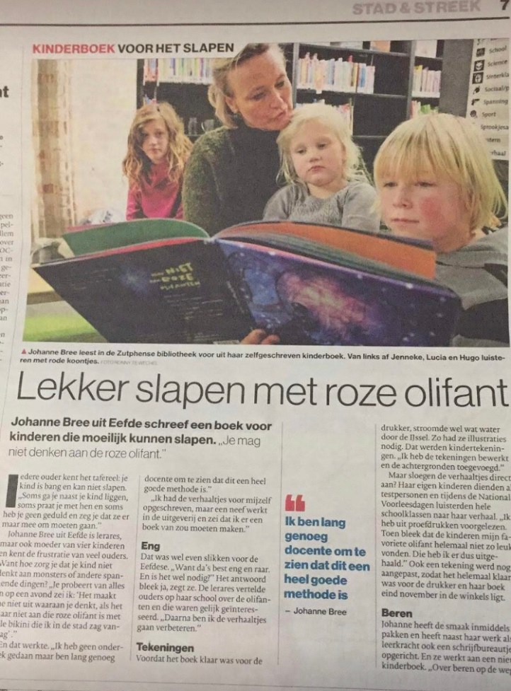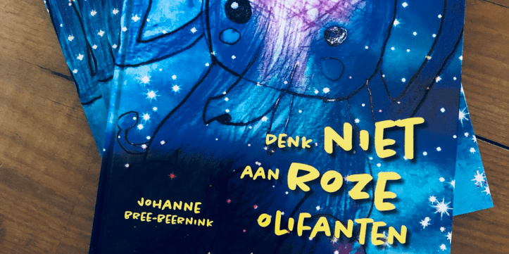 Het prentenboek dat in oktober 2018 uitkwam, heb ik gemaakt naar aanleiding van onze gesprekken over roze olifanten tijdens het slapen gaan. Het boek richt de aandacht van de negatieve gedachten af die kunnen belemmeren als een kind lekker wil gaan slapen.
