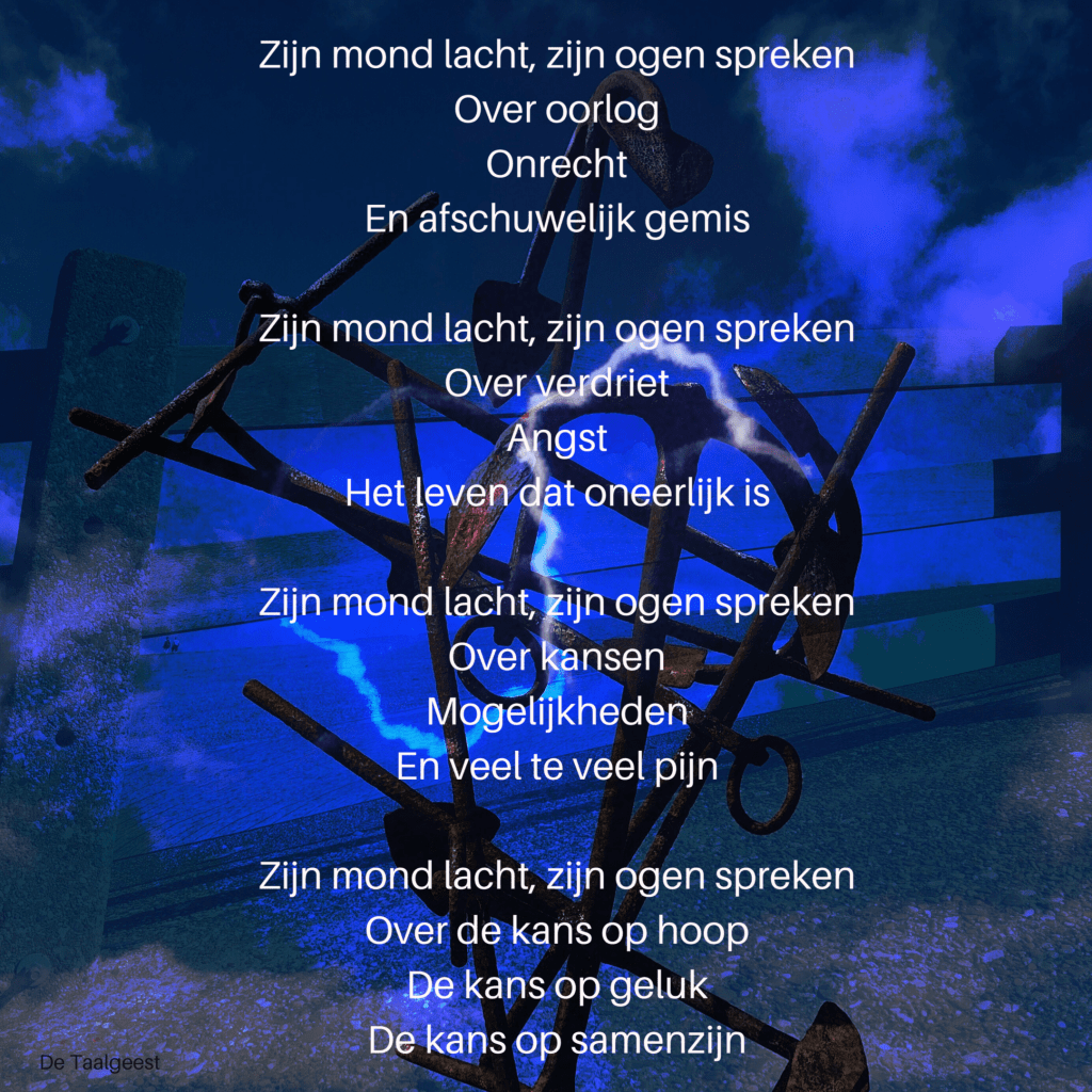 12 november 2020 De Taalgeest Zijn mond lacht, zijn ogen spreken Voor iedereen die hoopt op gezinshereniging. Leuk? Deel! Share op Facebook (Opent in een nieuw venster) Facebook Share on LinkedIn (Opent in een nieuw venster) LinkedIn Delen op WhatsApp (Opent in een nieuw venster) WhatsApp Share on Pinterest (Opent in een nieuw venster) Pinterest Meer Share on Pocket (Opent in een nieuw venster) Pocket Email a link to a friend (Opent in een nieuw venster) E-mail Vind-ik-leuk Aan het laden...