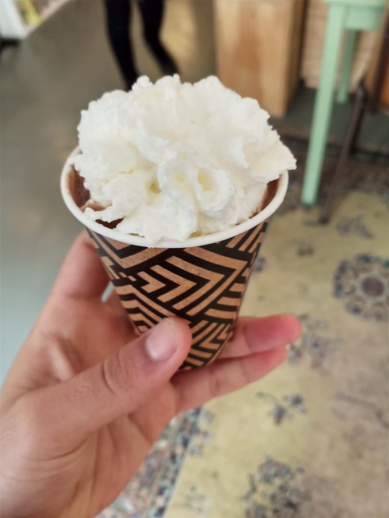 We dronken daar warme chocolademelk met slagroom en bekeken ( van een afstandje, want regenwater is niet zo bevorderlijk voor een boek ) een paar boeken, waaronder mijn eigen boek.