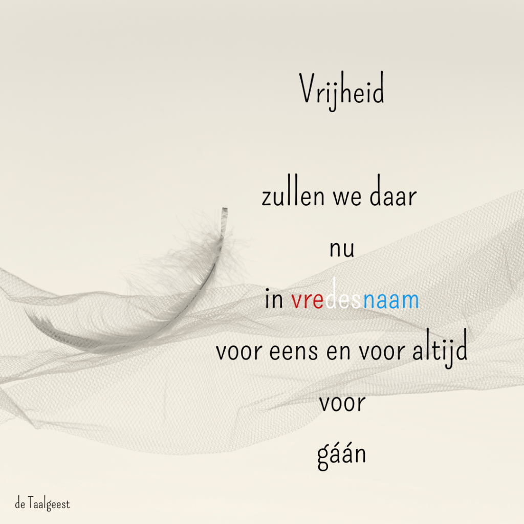4 mei 2025 De Taalgeest Vrijheid Leuk? Deel! Share op Facebook (Opent in een nieuw venster) Facebook Share on LinkedIn (Opent in een nieuw venster) LinkedIn Delen op WhatsApp (Opent in een nieuw venster) WhatsApp Share on Pinterest (Opent in een nieuw venster) Pinterest Meer Share on Pocket (Opent in een nieuw venster) Pocket Email a link to a friend (Opent in een nieuw venster) E-mail Vind-ik-leuk Aan het laden...
